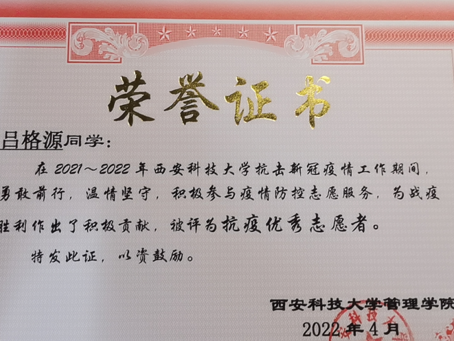 团支部鼓励团员青年投身社会实践活动与志愿服务之中,在社会实践与服务中完善自我、了解社会、培养品格,提高实践能力、增强责任意识,进而奉献社会,成为社会主义的传承者和接班人。截至目前支部成员共12人参加志愿服务活动,5人获得院级优秀志愿者荣誉,3人获得校级优秀志愿者荣誉,志愿汇时长总计94小时。在新冠疫情暴发的特殊时期,本支部团员积极报名成为防疫志愿者,在工作中敢为人先,毫不畏难,配合学校落实防疫政策,与学校齐心协力共筑防疫长城。