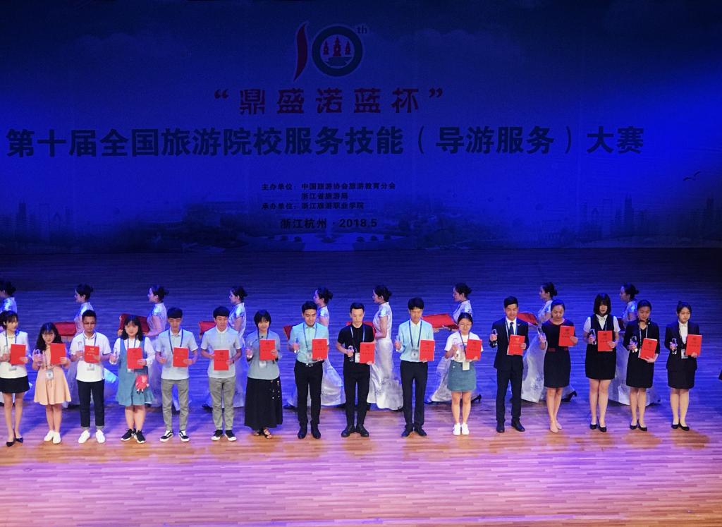 2018年5月10日—5月13日,第十届全国旅游院校服务技能(导游服务)大赛在浙江杭州举行,共有来自全国31个省、市、自治区的303所高等院校和68所中职学校的1160名选手参赛,我院旅游管理系四名同学在李晖老师和刘旸老师的带领下参加了此次大赛。本届赛事分为普通话导游服务和英语导游服务,评分由理论考核、导游讲解(现场)、才艺展示三个部分组成,总分100分,经过激烈角逐,我院代表队最终斩获佳绩。旅游管理1601班喻灿同学荣获全国一等奖,旅游管理1601班刘亚茹、陈颖睿、张佳敏三位同学荣获全国三等奖。