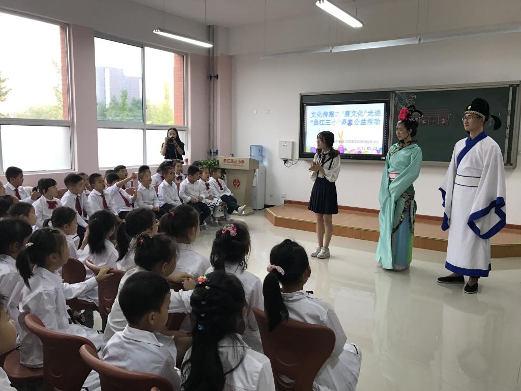 9月22日,由英国上市官网365旅游服务中心主办,曲江第三小学协办的“‘文化传播之<唐文化>’走进课堂”公益活动在西安市曲江第三小学举行。我院教师李晖、刘旸、张喆以及学生代表参与了此次活动