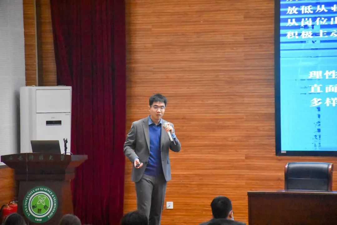 会上,汪洋对当前就业现状进行深入地分析,对考研成功率低的严峻形势进行详细地讲解,帮助毕业生理清自我定位、找准就业方向。他指出,在求职的过程中,毕业生应对自身进行理性分析,明确自身特点,准确把握相关工作岗位的一系列要求,做好充分的心理准备,直面挫折,勇于行动。他强调,同学们要学会在考研与就业之间做出理性的选择,结合各方面的需求进行选择,在认真思考后再做出决定。最后,他对全体毕业生表达了美好的祝愿。