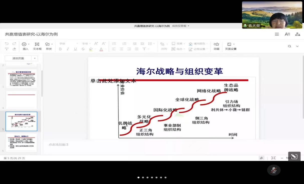 袁天荣教授直切主题,从海尔管理的创新历程、共赢增值表产生背景、共赢增值表内容、共赢增值表优势、共赢增值表应用条件五个方面为同学们讲述了共赢增值表在海尔的应用案例,内容十分丰富。