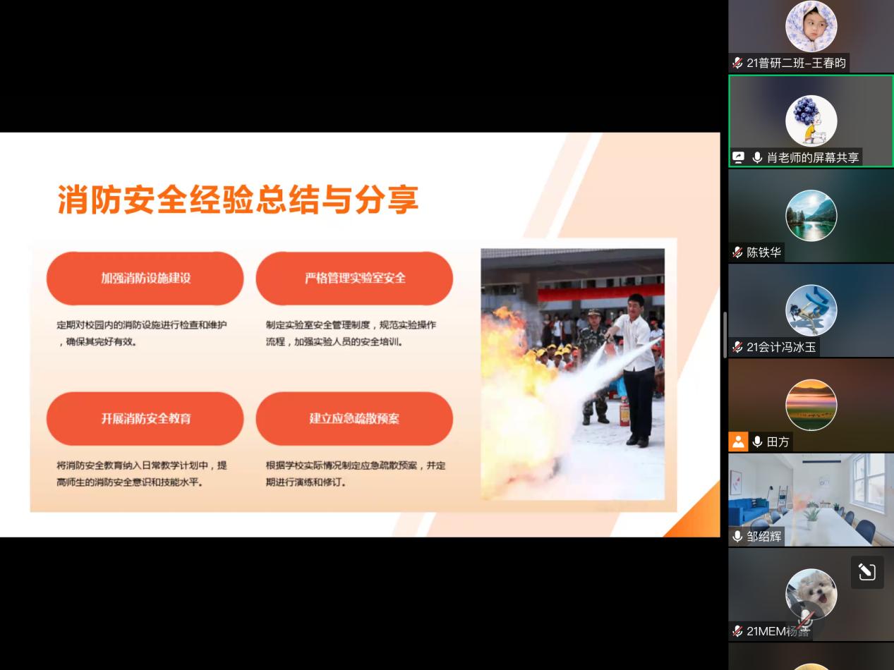 最后,教务员肖晶从高校火灾的原因、方式、案例与反思总结等方面细致讲解了高校规范安全用火用电的重要性。她强调安全责任在“预”不在罚,与其造成严重后果后悔不当初,不如将安全从小事做起。并讲述了应对火灾的技能,在一定程度上提高了同学们的安全防范意识。
