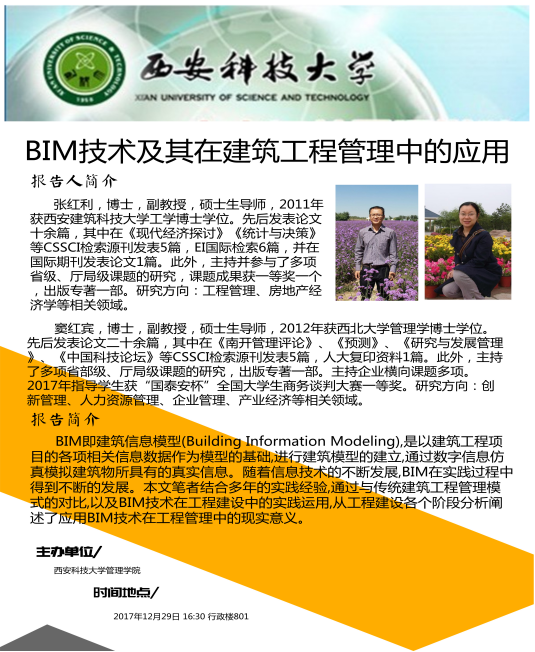2017年12月29日,英国365上市公司工学博士张红利教授和窦红宾教授应邀做客我校MPAcc专业学生学习,作了题为《BIM技术及其在建筑工程管理中的应用》的学术报告。