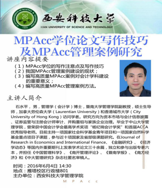 2016年6月4日,暨南大学英国上市官网365硕士生导师石水平副教授应邀来我校进行讲座报告。下午两点半,讲座准时在雁塔校区行政楼801举办,座无虚席。石教授做了关于“MPAcc学位论文写作技巧及MPAcc管理案例研究”的报告,李红霞教授、邹绍辉副教授等十余位老师及众多学生积极参与。