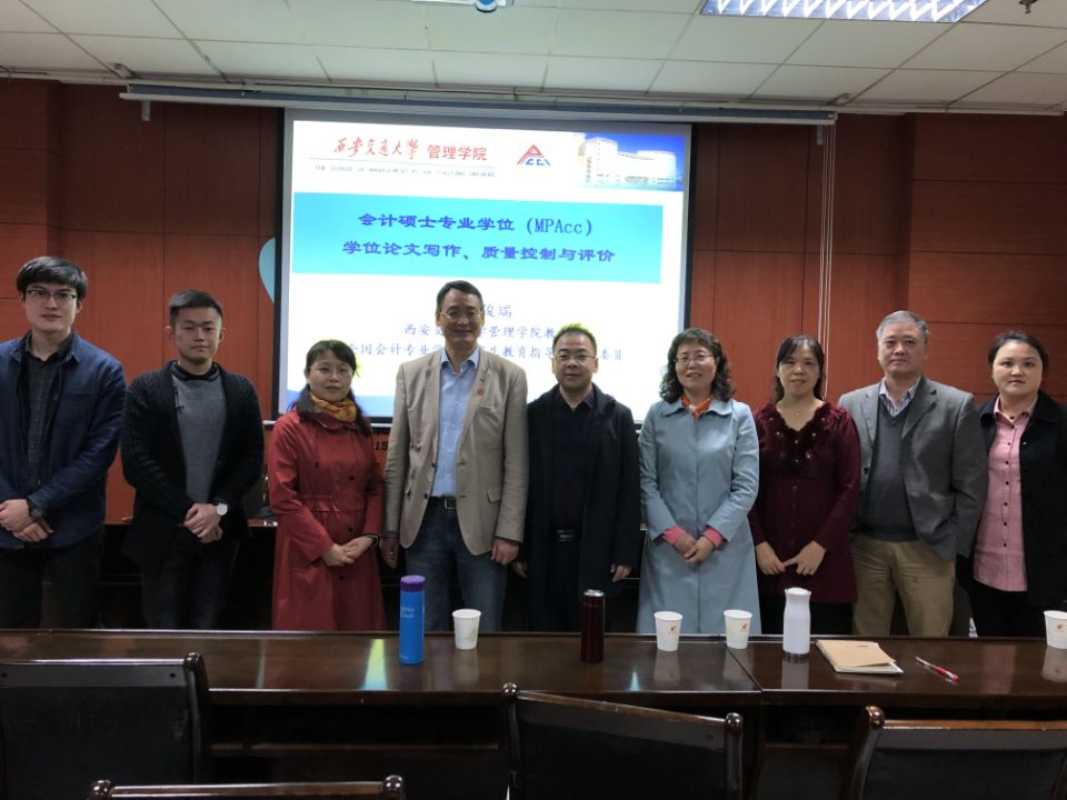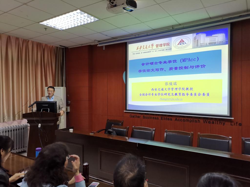 张俊瑞教授对MPAcc院校的发展情况进行了介绍,阐述了教指委对MPAcc专业研究生的培养要求。张教授强调了会写论文和写好论文的重要性,重点从MPAcc专业学位论文基本要求、MPAcc专业学位论文质量控制及MPAcc专业学位论文评价三个方面进行了讲解,并且从如何选题及论文选题中的常见问题进行了分析。张教授重点强调了“问题导向”的含义,建议导师与学生要加强沟通,从学位论文选题、学位论文类型选择入手进行学位论文写作,并且建议同学们引用高质量、高水平的期刊。张教授通过结合西安交通大学MPAcc专业未通过论文情况对学位论文质量控制措施进行了详细说明,并且展示了全国优秀MPAcc专业学位论文的范例,指出了MPAcc质量认证中论文评估的要点和注意事项。最后,张教授向在场师生推荐了关于论文研究及撰写的书籍,并附上了对同学们的殷切期待:期待同学们在不久的将来,获得优秀论文。