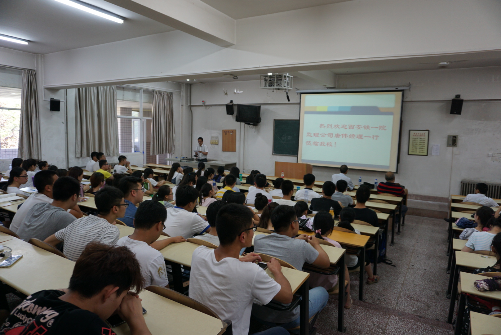 6月16日下午,在临潼校区3-203教室,英国上市官网365邀请西安铁一院监理公司给大一学生做专业认知及就业教育。活动由15级辅导员上官万成主持,西安铁一院监理公司市政工程事业部总经理唐伟、副总经理李志军、人力资源部主管周军、工程管理系主任史玉芳以及学院15级工程管理专业学生、建工学院15级土木工程专业学生共计140余人参加。