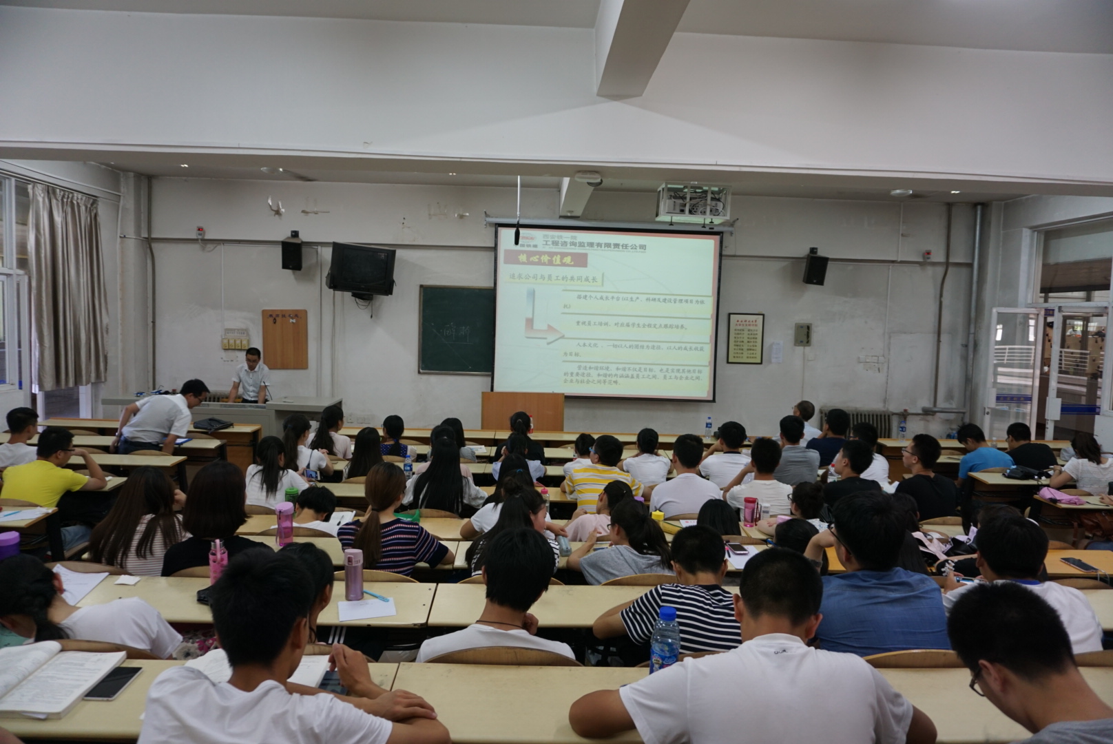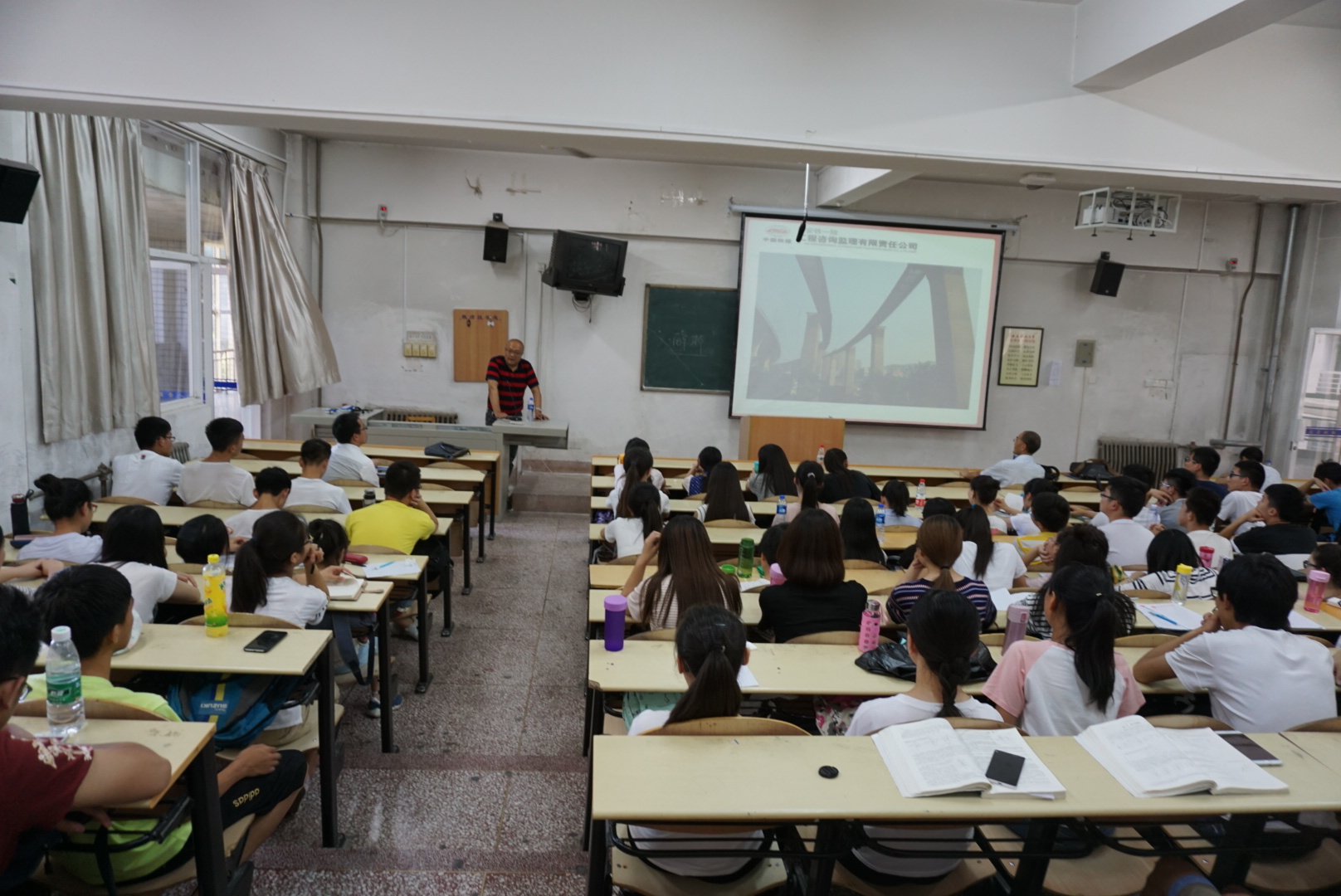 唐伟总经理以《机会总是给有准备的人》为题,向学生讲授了工程领域前沿科技项目如跨座式单轨、钢轨道梁等,建筑领域五大集团等。他勉励大学生紧跟“一带一路”、城镇化、城市轨道交通、城市管廊和海绵城市、网络交通等国家大形势,掌握建筑信息模型BIM,适时考取专业资格证,兼学一些小语种,广泛阅读,提升自己的综合素质,使自己成为未来招聘市场的“香饽饽”。现场学生认知聆听,兴致高昂。