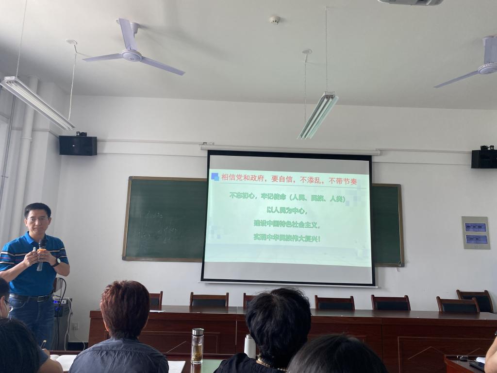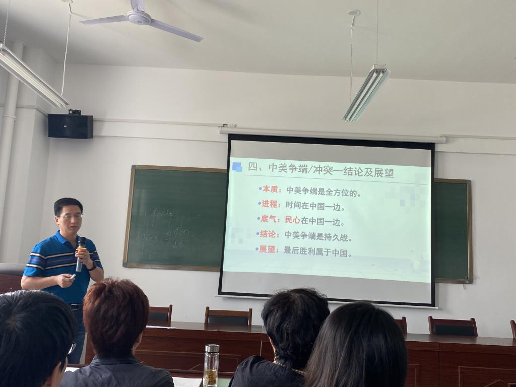 王院长重点分析了中美关系,新冠疫情下中美两国的国内形势,中美贸易战等方面,勉励教师们和同学们,要增强”四个意识”,坚定”四个自信”,不忘初心、牢记使命,投身建设中国特色社会主义的事业中去,实现中华民族伟大复兴!