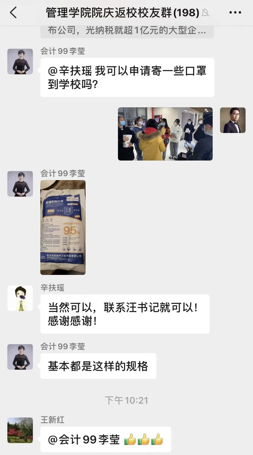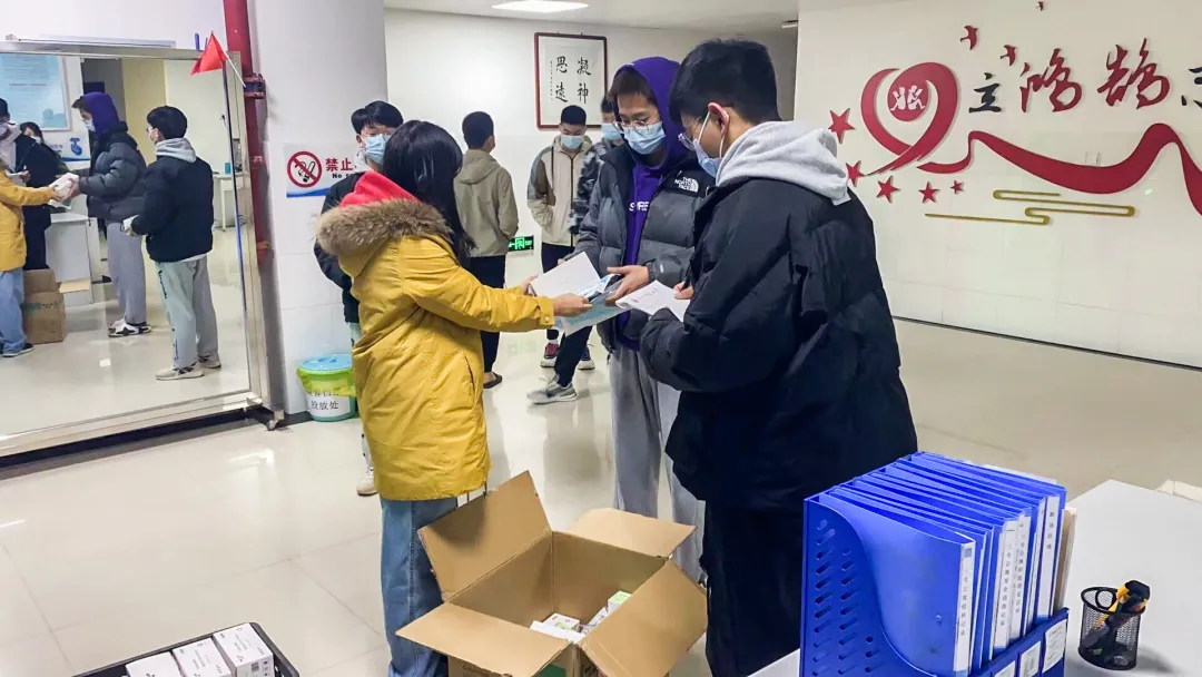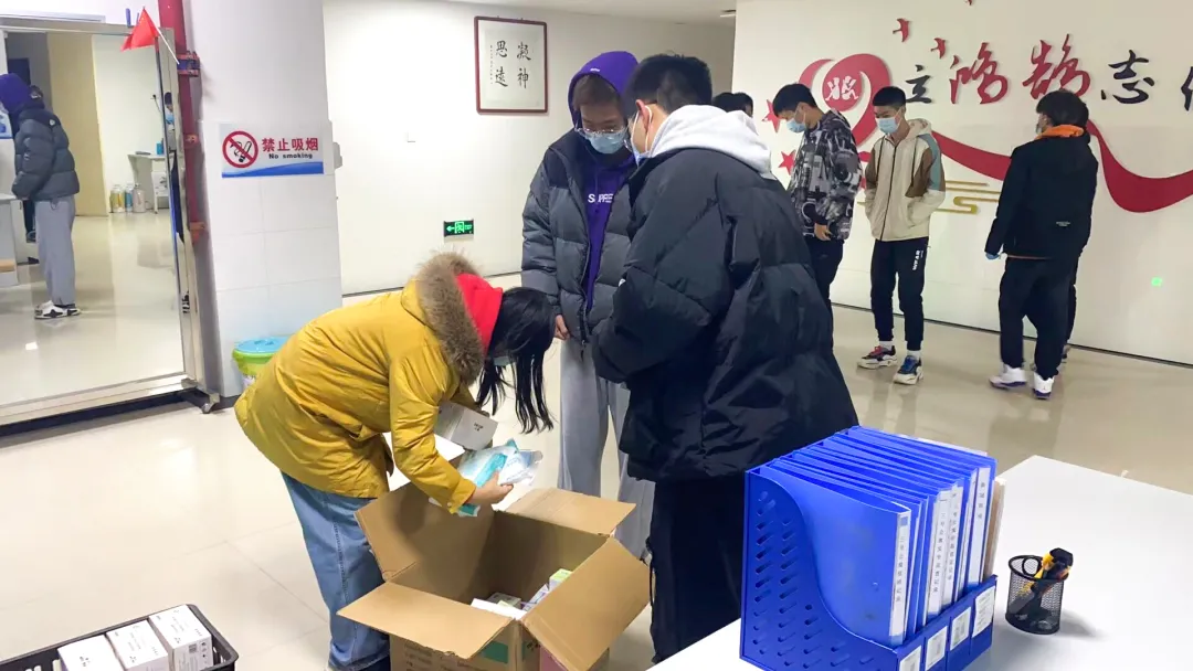学院为学生志愿者每人发放10个口罩,口罩由校友捐赠,并为外出买饭同学配发手套。