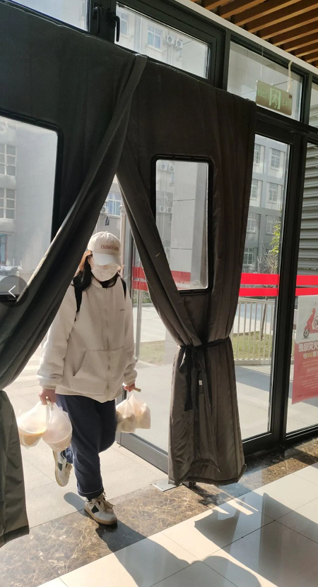 面对严峻的疫情形势,同学们积极配合学院的防控措施:志愿者楼道值班监督同学们不串宿舍、宿舍只出一人带餐、人人戴口罩出行等等