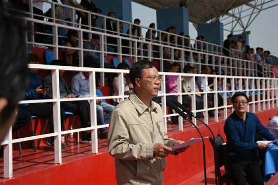 王贵荣副校长为本次运动会致开幕词,他首先对本次运动会的顺利召开表示了真挚的祝贺,向精心筹备本届运动会的工作人员、教练员表示诚挚的谢意,向全体运动员、裁判员致以亲切的问候和美好的祝愿。同时,他希望运动员们能够秉持良好的运动精神,努力拼搏,奋勇争先,公平竞争,赛出风格;希望裁判员们能公正执法,恪尽职守。最后他也预祝本次运动取得圆满成功。