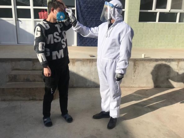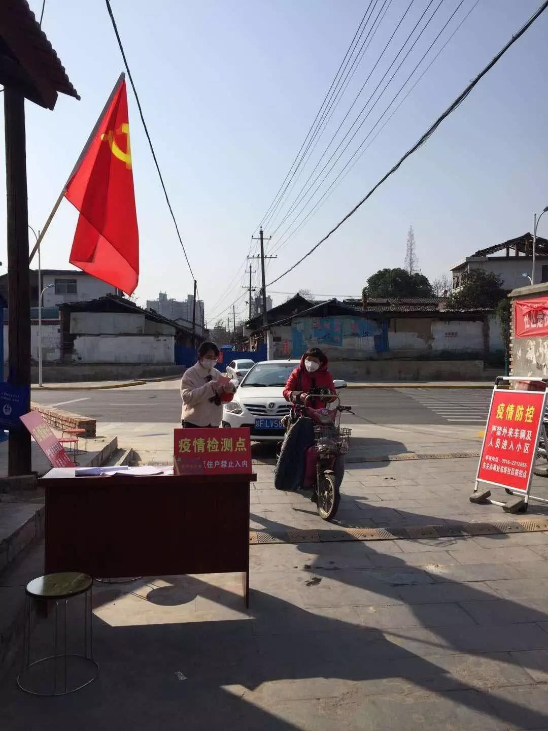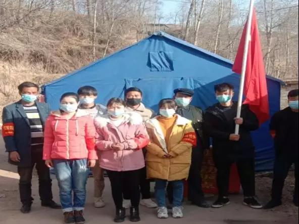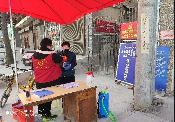 2020年2月11日,全村大学生为做好疫情防控工作进行值班,配合村医测量体温。