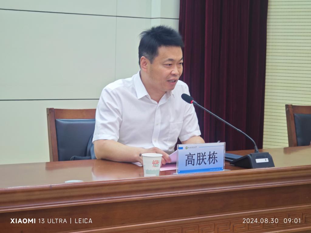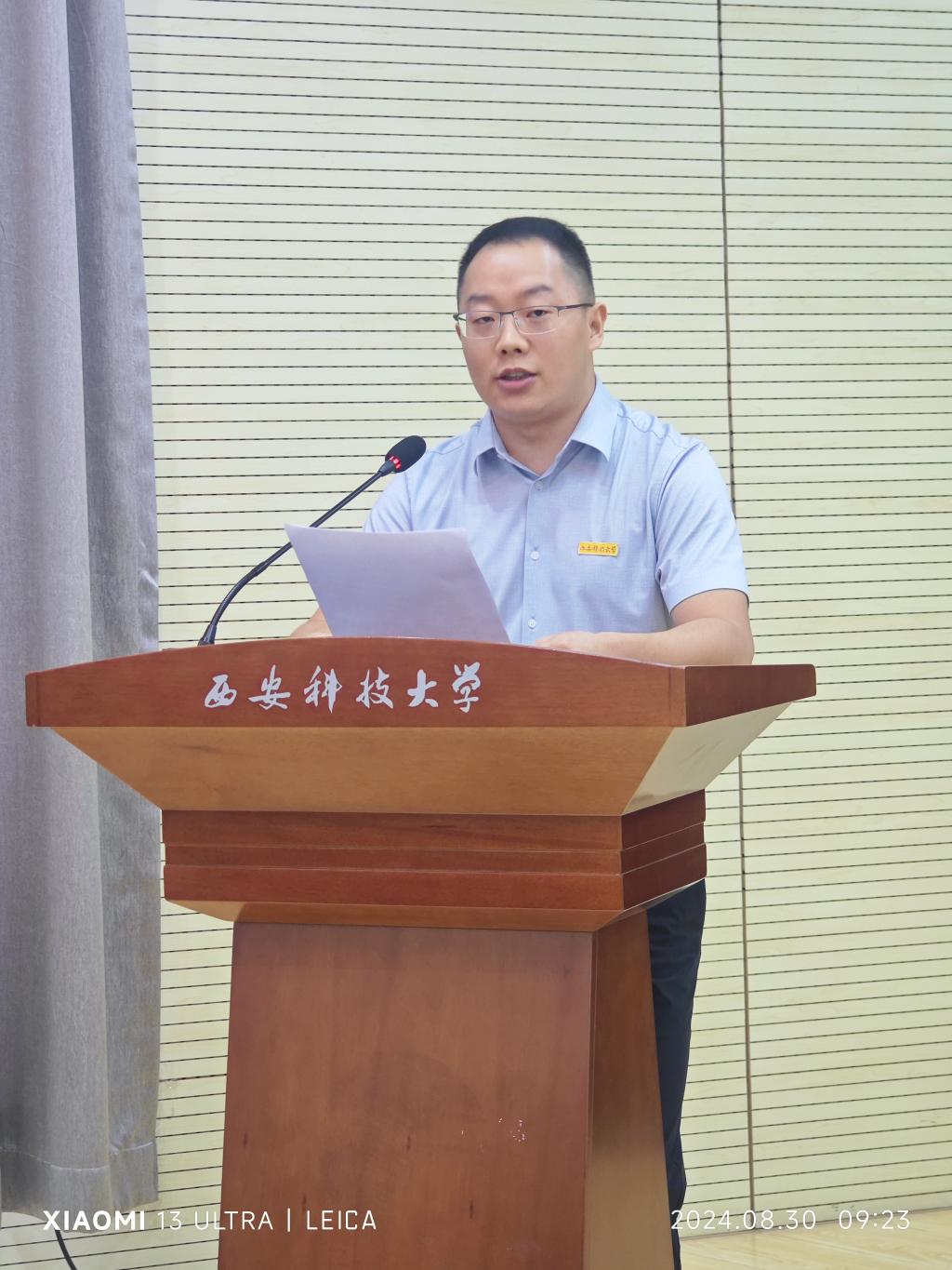 2024级新生代表张代露同学,重回母校读研,倍感荣幸。他在发言中首先表达了对母校、老师的感恩之情,并同大家一起分享了在本科创新班收获的四句座右铭:要名誉更要信誉,要学历更要能力,要就业更要创业,要财富更要回报。他还号召同学们一起努力,坚持理想,启航研梦,共同开启人生新的篇章。