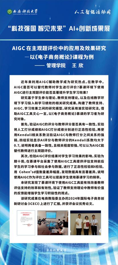 本次活动展示了教学研究热点问题AIGC的辅助教学效果应用,该研究成果发现了慕课环境下使用AIGC工具能有效改善教师评估支持的效率和有效性,该研究成果被评为“2024年国际电子商务创新研讨会”会议优秀论文。乡伴智课项目敏锐洞察AI教育新趋势,以AI双师课堂打破城乡教育壁垒,同时搭建AI智能体系统,为乡村教师提供全天候智能化教学支持,该项目获得全国大学生电子商务“创新、创意及创业”挑战赛省级一等奖、中国大学生国际创新大赛省级银奖等多项荣誉。