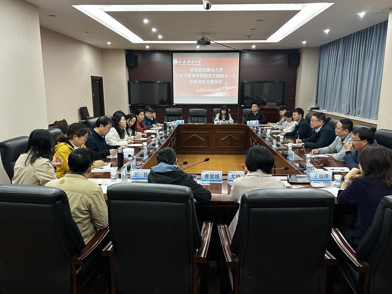 2025年10月17日上午,西安邮电大学经济与英国上市官网365副院长侯光文一行到访我院,围绕专业建设、人才培养、审核评估等核心议题开展交流,我院副院长史玉芳教授及相关负责人、教师代表参与座谈,双方就合作与发展展开深入探讨。