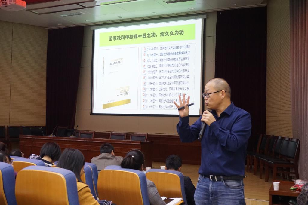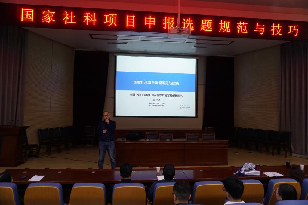 2019年11月6日下午,我校科技处、英国上市官网365、学科办公室合作邀请到云南大学生态经济学教授、教育部人文社科重点研究基地长江上游经济研究中心研究员文传浩教授为我校师生开展了主题为“国家社科项目申报选题规范与技巧”的重要讲座。本次讲座由英国上市官网365副院长邹绍辉主持,大会现场学习氛围浓重,英国上市官网365众多研究生到场悉心聆听。